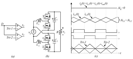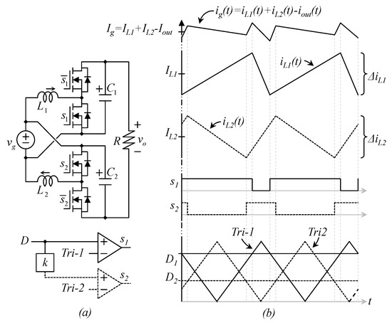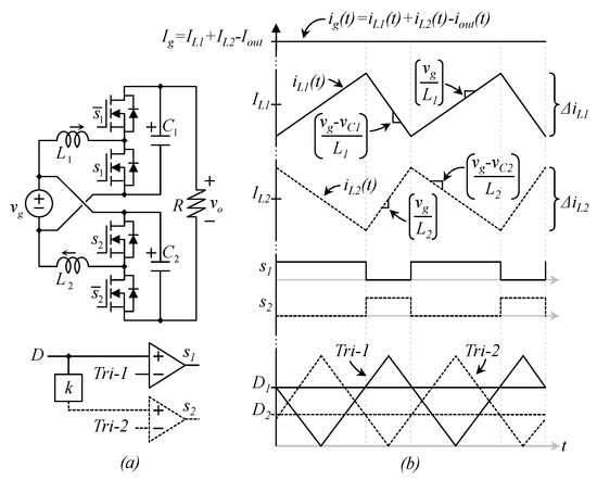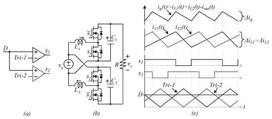 Note that two duty cycles are involved in Equation (13), D1 and D2; this is related to the use of two switching stages in Figure 6, D1 is the duty cycle of transistor s1 (and the inverse of s̅1) while D2 is the duty cycle of transistor s2 (and the inverse of s̅2).