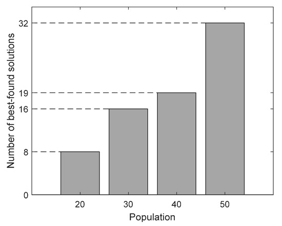 A summary of the results from Table 1 can be observed in Figure 10. This figure shows the number of best-found solutions for every population size. From the figure, it is evident that the number of best-found solutions increases as the population grows. For an operating range of 32, a population size of 20 individuals reaches 8/32 best-found solutions, a population of 30 achieves 16/32, and a population of 40 gets 19/32. In contrast, a population of 50 reaches the best values for the complete operating range. A population bigger than 50 individuals was not reported in the experiments since it does not significantly improve the results but increase the computational cost. Therefore, we adopted a population size of 50 for the optimization process.
