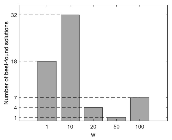 From Table 3, it is evident that the best value for the factor w is 10. The information from the table is condensed in Figure 12. This figure shows the number of best-found solutions for every configuration, considering the 32 operating points. As can be seen, the highest number of best-found solutions is reached when the constant factor w is 10. Therefore, this value has been adopted for the optimization process.