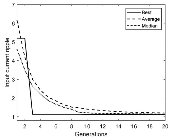 Figure 13 illustrates the convergence of the L-SHADE algorithm to analyze its search performance. The figure shows the speed of the L-SHADE method in searching for the optimal solution when the operating point G = 7.5. From 100 independent executions, the convergence of the best-obtained input current ripple, the average, and the median of the 100 results is presented in Figure 13.