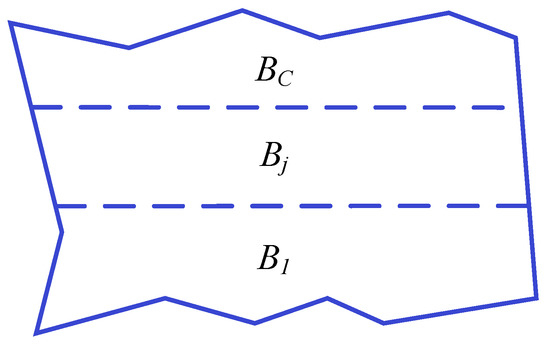 Let be the population after the iterative T′ round of genetic algorithm. Let π be a permutation of R and π ∈ . For the irregular plate (Figure 6), the boundary polygon B and the set of defect polygons D are represented by blue and red, respectively. The boundary polygon is divided into C subplates, that is, B = {B1, …, Bj, …, BC}. Let U = {U1, …, Uj, …, UC}, Uj be the set of rectangles to be packed corresponding to the subplate Bj, and Uj = π, where U1 = π, that is, B1 is the initial layout subplate.