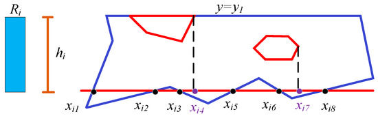 In Figure 1, the subplate has three shapes, namely, B1, Bj, and BC, and exhibits horizontal edges. Here, we take B1 (the top edge of the polygon is a horizontal line) as an example to calculate the movable positions. The ordinate of the horizontal line of the B1 is y1. We align the top edge of Ri with the horizontal line of B1 and calculate the intersection of B1 and y = y1 + hi as the movable positions (Figure 2). Moreover, we must update Xi by removing elements from the queue that is smaller than the current packing point and adding current packing point to Xi as the initial movable position. If defects are present in the subplate, then the rightmost points of these defect polygons are added to Xi as the candidate moveable point, see Figure 3. When calculating the first packing rectangle of a subplate, the initial movable position of the rectangle must be adjusted in accordance with the subplate shape.