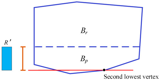 | (2) Find the second lowest vertex of the plate B, and subtract the height h’ of R’ from the ordinate to obtain a horizontal line, thereby dividing B into the upper subplate BR and the lower subplate BP; BP is the current packing region (see Figure 4). |