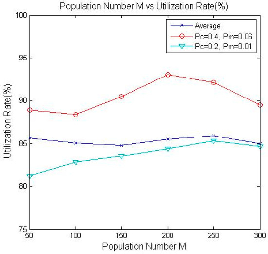 The relationship between the population number M and performance is as shown in Figure 9. We set the round iteration number to be fixed at 100. Among the three lines in the figure, two lines are the slates’ utilization rate under the randomly selected fixed parameters Pc and Pm, and the other is the average value of the slates’ utilization rate of all Pc and Pm under a different M. It can be seen from the figure that the performance of the population number is better when it is 200−250, hence, we chose M = 200 for our algorithm in the subsequent experiments.
