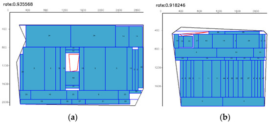 According to the results shown in Table 3, the Algorithm 2 we proposed is better than Jin’s algorithm by about 1% in utilization rate on the rectangular plates with rectangular defects, but Jin’s algorithm is much faster than our Algorithm 2, as shown in Table 2. The reason for this is that Jin’s algorithm is similar to our Algorithm 1, which is a heuristic algorithm. Our Algorithm 2 actually iteratively tried tens of thousands of Algorithm 1 to find the best performance. Therefore, even under the rectangular plates, our Algorithm 2 performs better than Jin’s. In addition, the utilization rate of the polygonal plates has increased by 5–7% in Dataset B. The reason for this is that when Jin’s algorithm is applied, the polygonal plates must first be cut to the largest rectangle. The edge part cut in this process may be utilized in Algorithm 2, so the utilization rate of Algorithm 2 is improved.