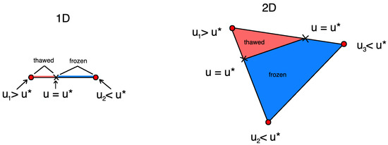 where the unfrozen zone volume and the volume of the cell are calculated as the area of corresponding triangles. Approximations of the for other cases can be calculated in a similar way. In Figure 1, we present an illustration of thawed and frozen zones on mesh cell .