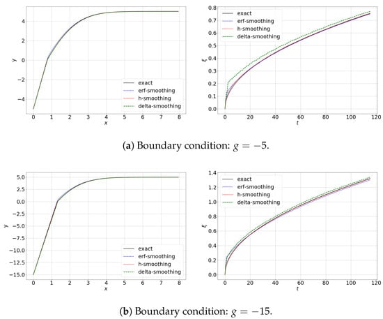 In Figure 2, we present exact and numerical solutions at the final time days and a phase change interface location . We present the results of the numerical solution of the problem using three types of smoothing. Numerical calculations were performed with (mesh by space) and for the time approximation. We consider the case with C and C. The smoothing parameter is chosen constant throughout the entire computation time . In the left figure, a solution at the final time is presented, where we see that the first derivative of the function has a discontinuity of the first kind with respect to spatial variable x at , which agrees with the Stefan condition. In the right figure, we depict a phase change interface location by time. In numerical calculations, the phase change interface is found through the linear interpolation method in the interval, where the sought function has different signs at the ends . We observe that the numerical solution both for the temperature at the final time and for the phase change interface location is accurate for smoothing using error functions (erf-smoothing) and for smoothing in one spatial interval (h-smoothing). We note that the novel method based on smoothing in one spatial interval is more accurate than the scheme with approximation using the parameter, that is, in general, it should be carefully chosen for each test case and depends on the mesh size, number of time steps, and speed of the phase change interface propagation.
