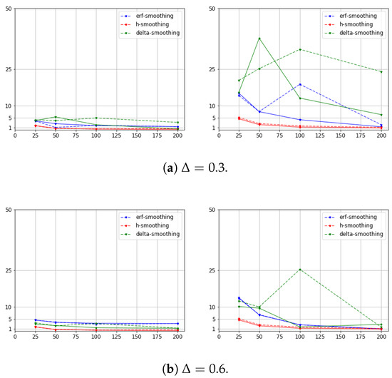 In Table 1, Table 2 and Table 3, we present the relative errors for the three methods: erf-smoothing, h-smoothing, and linear delta-smoothing. We present relative errors in % and investigate the influence of the boundary condition, smoothing interval , and the space and time mesh parameters on the accuracy of the numerical solution. In Table 1, the relative errors for the scheme with smoothing using an error function are presented (erf-smoothing) for and , where errors for are presented on the left and for presented on the right. In Table 2, the results for the scheme with smoothing in one spatial interval (h-smoothing) are presented. Relative errors for the scheme with linear smoothing on the interval are presented in Table 3 (h-smoothing) for and . From the errors between the exact and numerical solutions ( and ), we observe that the erf-smoothing and linear delta-smoothing methods are highly dependent on parameter . The error decreases along with the spatial mesh refining as the number of time layers increases.