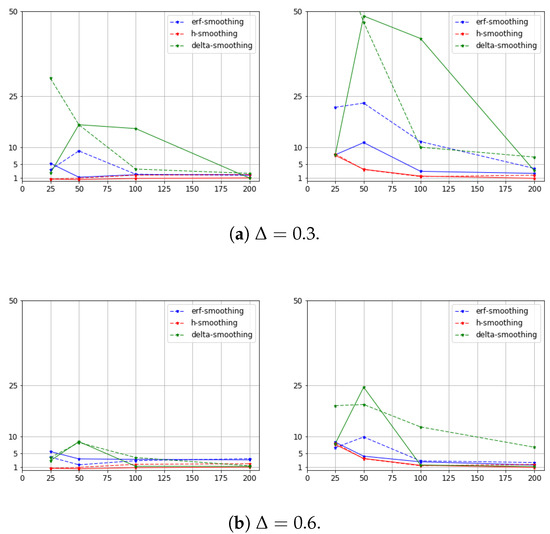 A graphical illustration of the errors from Table 1, Table 2 and Table 3 for the presented methods is shown in Figure 3 and Figure 4. We depict errors for and with different spatial mesh parameters n and . The h-smoothing scheme provides accurate results on a coarse spatial grid at large time steps. We observe that the erf-smoothing method is less sensitive to the parameter and provides sufficiently good results with a good choice of the parameter . By comparing the results for and in Figure 3 and Figure 4, we see that for a larger temperature gradient, we obtain worse results. In the erf-smoothing and delta-smoothing methods, we should use a finer mesh and more time steps for better approximation with a good choice of parameter . The scheme with smoothing in one spatial interval provides an accurate numerical solution with the minimal smoothing interval, which is different in each spatial interval and time layer.