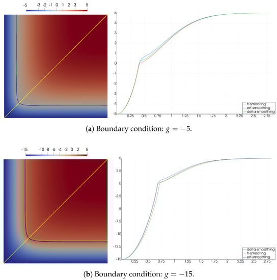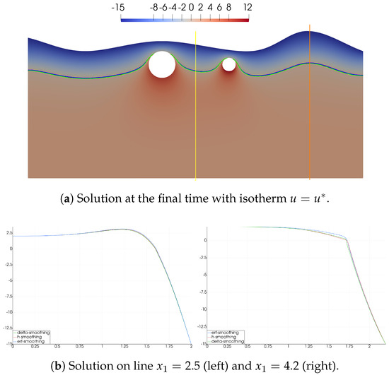 In Figure 5, we present the numerical solution at the final time for C and C. In the left figure, we depict a temperature field at the final time with an isotherm of (phase change interface). In the right figure, we show a solution on line , where the line is depicted in yellow color in the left figure. The phase change interface at the final time is depicted for three types of smoothing and indicated in different colors. Here, we use a similar color in the right figure to plot the temperature along the line . Numerical calculations are performed with (mesh by space) and for the time approximation. The smoothing parameter is chosen as constant .