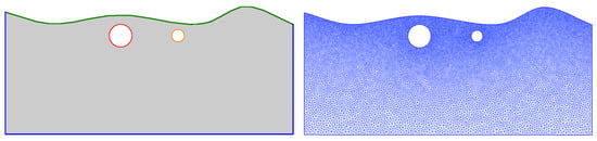Geometry with unstructured grid. Left: computational domain (gray color), top boundary (green), circle one (red), and circle two (orange). Right: unstructured mesh with triangular elements.