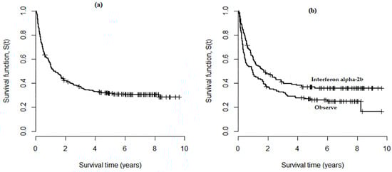 (a) Overall survival curve obtained by Kaplan–Meier approach for the e1684 data; (b) Survival curves for the two types of treatments.
