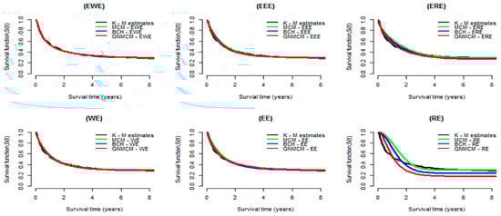 Plots of survival curves obtained by the Kaplan–Meier approach versus respective predicted survival values obtained by MCM, BCH and GNMCM based on EWE distribution are depicted in Figure 3. There is no significant difference between the graphs in the three panels, which illustrates that these three cure models based on EWE distribution equally fit the data.
