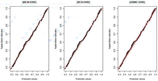 Plots of the Kaplan–Meier estimates for the survival functions versus the respective estimated survival values provided by MCM, BCH and GNMCM based on the EWE distribution. An ideal consent between the predicted survival values and Kaplan–Meier estimates is represented by the diagonal straight lines.