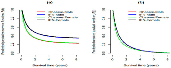 Let denote the event’s time occurrence and let be a probability of being cured. Furthermore, for susceptible subjects, assume that and are survival and density functions, respectively. Thus, the entire population survival function is