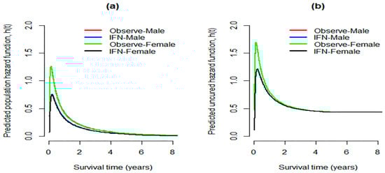 (a) Predicted population risk functions considering MCM model with EWE distribution; (b) respective susceptible hazard functions.