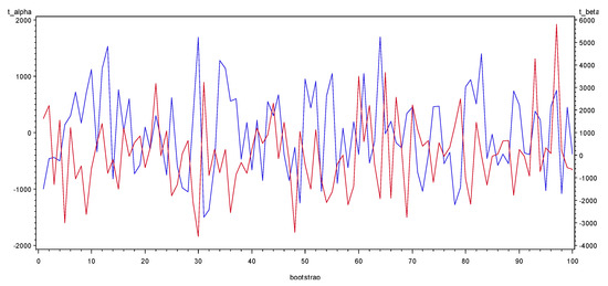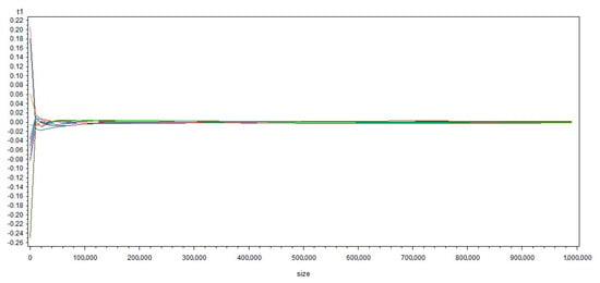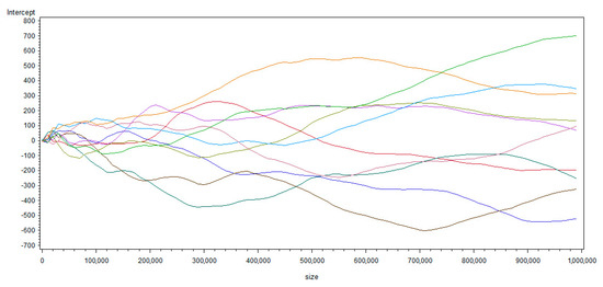 - From Figure 3, we observe that, as expected, when , converges to zero (the magnitude level of is 10−5 considering that the decimal precision of the 32-bit computer used is 10−7, which is almost not-different from zero) and is divergent even if the seed values are modified. For 100 different simulations, the conclusions still hold, which indicates that there is no problem of pseudo-randomness in our simulations (even if their conclusions are correct, the simulations by Granger and Newbold (1974) [3] as well as by Nelson and Kang (1981) [11] did not pay attention to the pseudo-randomness, nor specify how the random numbers are obtained). By performing them, as we set all equal to zero, if is convergent, then it must converge to , in other words, to zero. However, seriously deviates from its mathematical expectation zero for different simulations. Thus, the regressions are spurious because the OLS estimator of the trend converges to zero and the other OLS estimator diverges when the sample size tends to infinity.