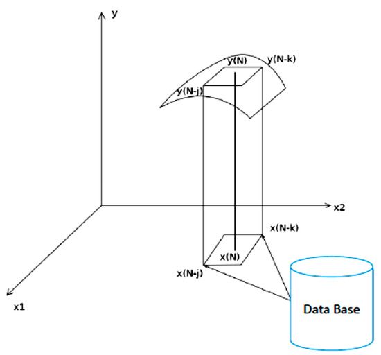 1. At the first stage, a point (the adjective “point” means here “for a certain time step”) linear model of a nonlinear process is created. By data mining, the values of the input variables (in the general case, a vector) are selected from the process history that are close to the current value of the input variable subject to a certain criterion. The selected values of the historical data correspond to the actual values of the outputs [12,13,14]. Further, a consistent system of linear equations is formed. The only solution to this system by the least squares method gives the values of the linear model coefficients as well as the forecast of the output at the next time step. The described identification method for a nonlinear dynamic object may be called “intelligent least squares”.