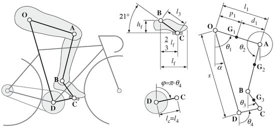 Inspired to [,], the bicycle–leg system has been modelled as a planar five bar linkage characterized on the basis of anthropometric scale factors [,]. Figure 1 shows the skeletal model adopted and gives the basic nomenclature used to describe the kinematics of the system. The vector contains the absolute orientation from the vertical axis of the four moving segments of the system, assuming as positive an anticlockwise rotation. The subscripts i (i = 1:4) refers in the order to: thigh, shank, foot and crank. The length of the ith link is indicated by . Lengths and indicate the proximal and distal position of the center of mass with respect to the extremities of the ith body segment, so that . The length has been determined, as shown in Figure 1, assuming that the pedal spindle is fixed at two thirds of the total length of the foot; as a result, the segment forms with the pedal a constant angle equal to . The seat tube angle is set to an average value between road and triathlon, i.e., . Based on the saddle height method [,], the constant distance s is determined by the following formula: