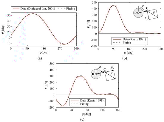 External forces applied to the system are required for the Newton–Euler method, in particular the force applied to the foot by the pedal. Experimental data, given as average trend between different subjects and conditions, are available from []. Effective and radial components of the force ( and , respectively) are given versus the crank angle, as shown in Figure 2b,c. Data refers to a pedalling cadence of and an average net power, hereafter called resistant power, of . Once the cadence and the power of a different pedalling regimen are defined, the forces must be scaled by the ratio as follows: