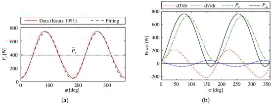 (a) resistant power vs. crank angle ; data from [] and fitting obtained by Equation (15); , ; (b) components and total power output vs. crank angle ; , , , .