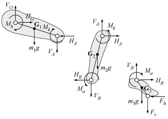 The scheme of Figure 4 shows the free body diagram of the leg used to formulate the dynamic model by means of the Newton–Euler method. The horizontal and vertical components of the pedal force, and respectively, are calculated starting from the fitting law (11) of and , as expressed by the first two equations of the system (12):