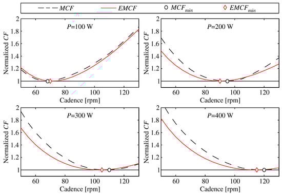 In this section it is firstly given the comparison between MCF and EMCF when they are involved in the minimization problem; the comparison is done at increasing average power outputs, corresponding to increasing values of upper limit cadences. Figure 5 shows the comparison between MCF and EMCF, plotted versus the pedalling cadence. Both cost functions have been normalized by their minimum value, so that occurs when the CF is equal to 1. Plots, based on simulations, refers to a cyclist with and exerting a power output from 100 W to 400 W. Values of are comparable in all cases, with greater values at increasing powers, as evidenced by experiments in literature []. Therefore, it can be said that the minimization of the equivalent moment gives similar results with respect to the minimization of the approximated average muscular stress.