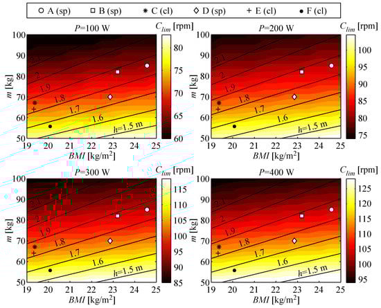 The study can be extended to different body characteristics: once the mass and the height are given, all the geometric and inertial properties of the kinematic and dynamic models can be obtained by means of a scaling procedure based on anthropocentric average factors [,]. As explained in Section 2.2.2, also the power applied to the crankset can be scaled on the basis of the imposed average power output. Thus, the upper limit of most convenient cadence rate has been investigated for a series of cases, ranging the mass from 50 to , the body mass index (BMI) from 19 to and the power output from 100 to . Results are plotted in Figure 6. Solid black lines are iso-height curves, while markers refer to six different professional riders considered for simulations; the three white markers, in particular refer to sprinters (sp), whereas black markers correspond to climbers (cl). It results clear from plots, as confirmed by the facts, that climbers have higher optimal cadences than sprinters. Furthermore, for all cyclists increases for increasing powers. Anthropometric data of the six the simulated cyclists are collected in Table 3, whereas obtained with each one of the cost functions are reported in Table 4. Results are comparable in all cases; the average error between the two methods is , exceeding this value in few cases related to low power outputs (100 W).