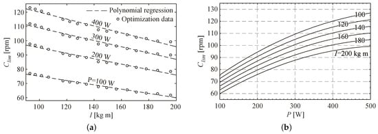 Riders in s Table 3 and Table 4 are listed with a descending order of the index I, defined as , that it was found to correspond to an ascending ordering of values. The correlation between (hereafter always determined minimizing the EMCF) and the anthopometric index I becomes even more evident in Figure 7a: data obtained varying the index I while keeping fixed a specified power P substantially align on a straight line. Therefore, we can expect that a polynomial regression of is possible. A satisfying approximation has been found using a polynomial form of the 1st order with respect to I and of the 2nd order with respect to P: