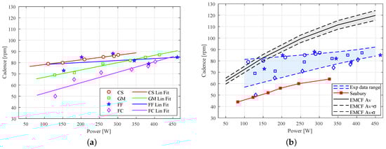 Experimental data obtained in this work, notwithstanding a certain dispersion and variability, give evidence to previous considerations. The analysis of data shows that the dispersion is mainly attributable to subjects FF and FC. A reason can be found in a change of gear ratio between low and high power exercises, resulting in a discontinuity that gives an “S” shape to the plot. Subjects CS and GM do not show such trend: in these cases data fit with high accuracy with a linear law. Aggregate data are well represented by the linear fit of Figure 8b; as supposed, cadences adopted by cyclists are placed in the central area, between cadences that minimize the muscular effort (EMCF minimization) and cadences that minimize the energy expenditure (data from Seabury []).