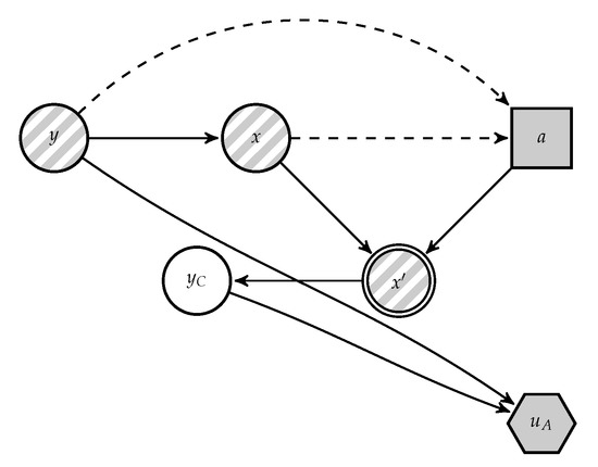 For this, the ID describing the classification problem (Figure 1) is augmented to incorporate adversarial decisions, leading to a biagent influence diagram (BAID) [27], Figure 2. In it, grey nodes refer to elements solely affecting A’s decision; white nodes to issues solely pertaining to C’s decision; striped nodes affect both agents’ decisions. We only describe the new elements. First, the adversary decision is represented through node a (the chosen attack). The impact of the data transformation over x implemented by A is described through node , the data actually observed by the classifier; the corresponding node is deterministic (double circle) as we assume deterministic attacks. Finally, the utility of A is represented with node , with form , when C says and the actual label is y. We assume that attack implementation has negligible costs. As before, C aims at maximising her expected utility; A also aims at maximising his expected utility trying to confuse the classifier (and, consequently, reducing her expected utility).
