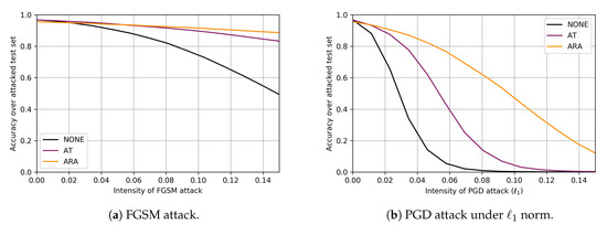 Robustness of a deep network for MNIST under three defence mechanisms (none, AT, ARA). (a) depicts the security evaluation curves under the FGSM attack. (b) depicts the security evaluation curves under the PGD attack.