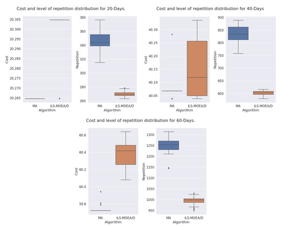 Something similar happened for the menu plans for days. In this case, the mean cost of the solutions provided by ILS-MOEA/D was only higher in comparison to the mean cost of the solutions attained by MA. The mean level of repetition of the solutions obtained by MA, however, was higher when compared to the mean level of repetition of the solutions given by ILS-MOEA/D. Finally, for days, the mean cost provided by ILS-MOEA/D was only higher in comparison to the mean cost attained by MA. Still, the mean level of repetition of MA was considerably larger than that obtained by ILS-MOEA/D, specifically, . Bearing the above discussion in mind, it is clear that the slight difference obtained by ILS-MOEA/D, in terms of the cost, is much lower when compared to the difference between the two approaches in terms of the level of repetition. As a result, ILS-MOEA/D clearly outperforms MA in this regard, which confirms our hypothesis.
