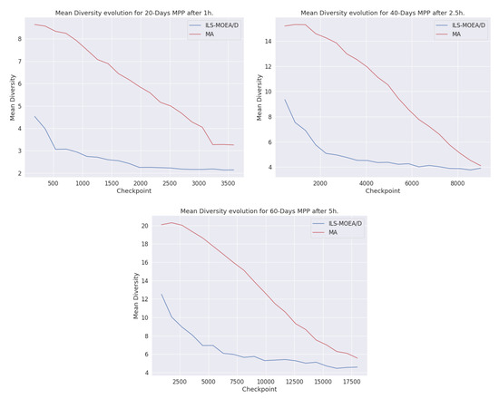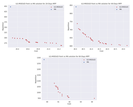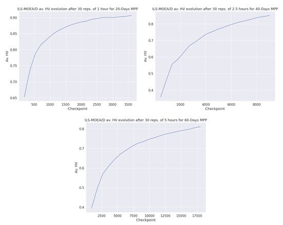 Standard configurations for MA and ILS-MOEA/D were applied to different instances of the MPP. Specifically, plans for , and days were considered. All the experiments were performed using the elapsed time as the stopping criterion, which was different depending on the instance size. For days, the stopping criterion was set to one hour, and it was increased to two and a half hours and five hours for and days, respectively.