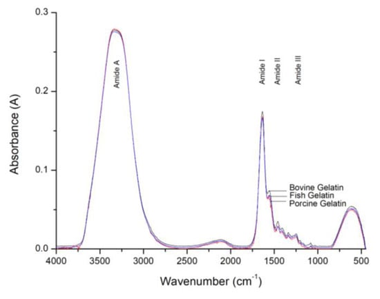 The FTIR spectra of bovine, porcine and fish gelatins are depicted in Figure 1. The spectra of the gelatins exhibit very similar patterns at 3600–3200 cm−1 (Amide A), 1700–1600 cm−1 (Amide I), 1560–1335 cm−1 (Amide II) and 1330–670 cm−1 (Amide III) regions.