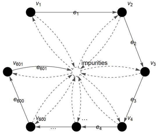 The first analysis involves a dataset of coffee products that is adopted from Briandet et al. []. The two types of their coffee products are Arabica and Robusta. The researchers [] differentiated the two types of coffee products using FTIR and PCA. The FTIR spectra of 29 samples of Arabica and 27 samples of Robusta were obtained and further analyzed using PCA in their study. However, in this paper, the spectra of Arabica and Robusta at the 1600–1000 cm−1 region are analyzed using c-FACS. The FACS graph of the coffee at the 1600–1000 cm−1 region is shown in Figure 6. The vertices  represent the position of wavenumbers for 1600 to 1000 cm−1 and the edges  are the light that travels and passes through molecules during the FTIR analysis.