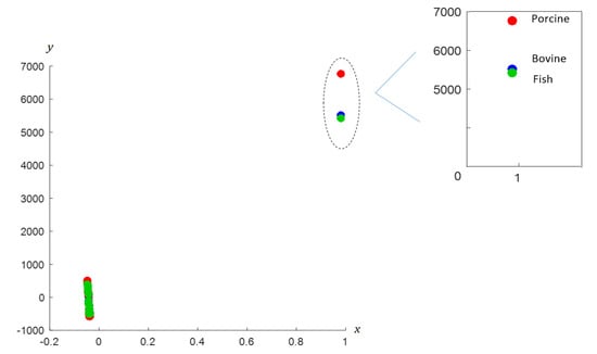 Based on the figure, distinct patterns for bovine, porcine and fish gelatin are observed, particularly on the right area. The nodes of each gelatin are dispersed at different locations; particularly nodes for porcine gelatin are clearly separated and located a distance away from nodes of bovine and fish gelatins. The result indicates that porcine gelatin has a unique feature as compared to other gelatins since it is at farthest distance, while bovine and fish are closer to each other. The information indicates that the distance signifies the relationship and characteristic between the variables. The c-FACS method has successfully identified the differences between the gelatins, particularly non-halal porcine, based on the dominant wavenumbers’ identification and location of their nodes in the Euclidean space. The unique and different dominant wavenumbers signify the feature for each gelatin. The performance of c-FACS is then compared against principal component analysis (PCA). The PCA is a well-established method in chemometrics analysis. It is usually implemented with the aid of MATLAB and Minitab software [,], and the results are displayed in the form of score and loading plots. The clusters of bovine, porcine and fish gelatins are observed in the score plot. However, significant wavenumbers for porcine and fish gelatins failed to be identified in the loading plot (see Figure 5).