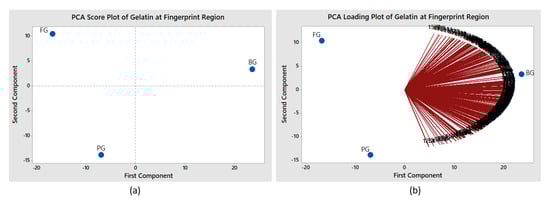 PCA (a) score and loading plots (b) for gelatins at fingerprint region.