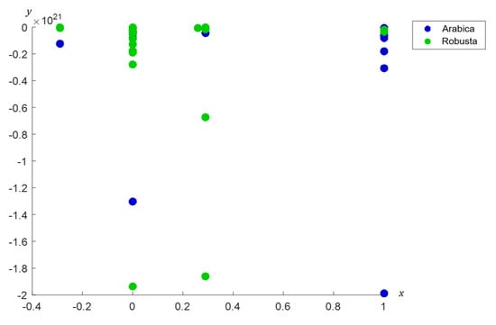 The dominant wavenumbers for Arabica are identified at 1447–1409 cm−1 and 1096–1058 cm−1. On the other hand, the dominant wavenumbers for Robusta are detected at 1297–1258 cm−1. These results indicate that each type of coffee bean has distinct and unique dominant wavenumbers. Furthermore, coordinated FACS shows that the nodes for Arabica are mainly clustered in the right area while Robusta’s nodes are mainly observed in the left area of the plane (see Figure 7).