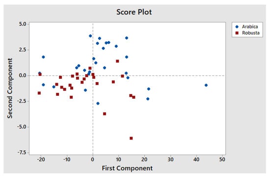 The results of the c-FACS are compared against PCA. The PCA score plot of the coffee shows that Arabica is clustered mainly in the upper right area, while Robusta is clustered in the left area (see Figure 8).