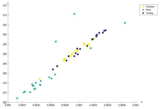 The c-FACS method is also applied on a dataset of meat, which is obtained from Al–Jowder et al. []. Three different types of meats, namely, chicken, pork and turkey, were used in their study. The spectra of the meats were obtained and PCA was used by the researchers []. In this paper, the spectra of the samples at 1600–1000 cm−1 region are analyzed using c-FACS. Its graph is shown in Figure 9.