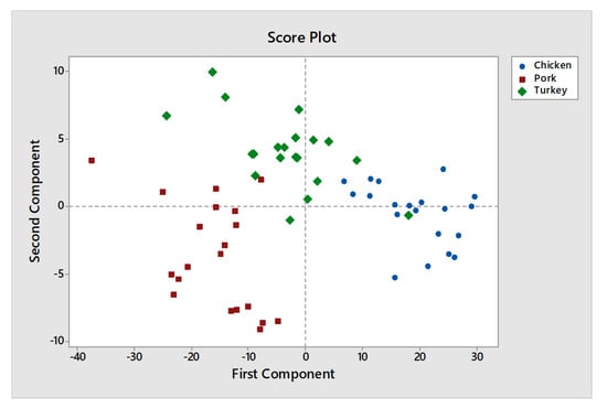 The results of the c-FACS are compared against PCA. The PCA score plot shows that the meats are clustered at different locations (see Figure 11), which are in agreement with the report published by Al-Jowder et al. [].