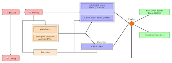 - Training of classification models—three algorithms are selected for this study (GLMlogit, LMM and CREA-RBS), and the methods are explained in Section 2.3.