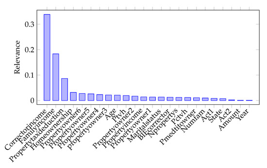 In Figure 3 and Figure 4, we can see the most influential variable in the IEF semi-synthetic and German Credit datasets, respectively. As we can see in Figure 3, the most influential variable in the IEF dataset is Correctorincome. This is a feature which aims to discriminate between people with higher income or lower than the minimum inter-professional salary (SMI); the lower is the income compared to SMI, the more complicated it is to grant the payment of a bank credit. The other two most relevant variables are Familyincome and total tax deduction related to main residence (buying or improvements). The rest of the features have marginal importance. Moreover, economic attributes are more relevant than social variables according to the gain ratio.