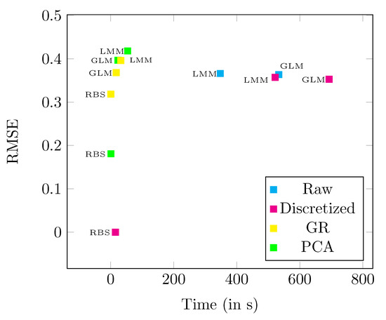 The mixture of the model precision (RMSE) with computational cost (time) is particularly interesting and is illustrated in Figure 5 The combination of a low time requirement and low value of RMSE shows the best methods. Three groups can be identified based on the results: