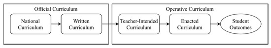 Much of the body of research on teacher curriculum use has employed several distinctions in curriculum to clarify what and how teachers interact with a curriculum. One such is a differentiation of curriculum into official curriculum and operative curriculum, which was introduced by Remillard and Heck [23]. They defined official curriculum as the set of curricular aims and objectives, content of consequential assessments, and designated curriculum. In comparison, operative curriculum is defined to include teacher-intended curriculum, enacted curriculum, and student outcomes [23].