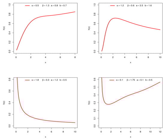 Figure 1 and Figure 2 display some plots of the pdf and hrf of X for selected parameter values. Figure 1 reveals that the NKwW distribution is right-skewed and reversed-J shaped. Also, Figure 2 shows that the NKwW hrf can produce increasing, decreasing, bathtub and upside-down bathtub shapes.