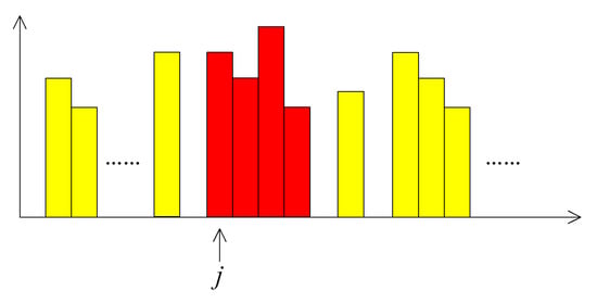 Step 1.2. Choose the column height and the largest column set from all the column sets, denoted as , and the position of the leftmost column in the set is denoted as , the number of columns is denoted as , and the sum of the heights of all columns is denoted as . For example, as shown in Figure 2 below, , .