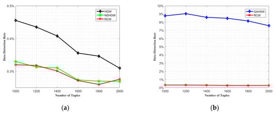 In experiments, tuples (rows) in a database are grouped according to the length of the watermark. When the watermark length is 48, it represents the number of values grouped in the database. RCW, NSHGW, HGW, and GAHSW were compared in turn and their distortion rates were verified when the total tuples were 1000, 1200, 1400, 1600, 1800, and 2000, respectively, with the same watermark. The experimental results were drawn as shown in Figure 3. In the figure, the vertical axis is DDR, which represents the ratio of data distortion; when DDR is zero, it represents the data of the database without distortion; and the horizontal axis represents the number of different tuples. The distortion rates of RCW, NSHGW, HGW, and GAHSW methods are the average of the results of 15 runs of the four methods, respectively. To show the distortion ratio more clearly, we will show the effect through Figure 3a,b.