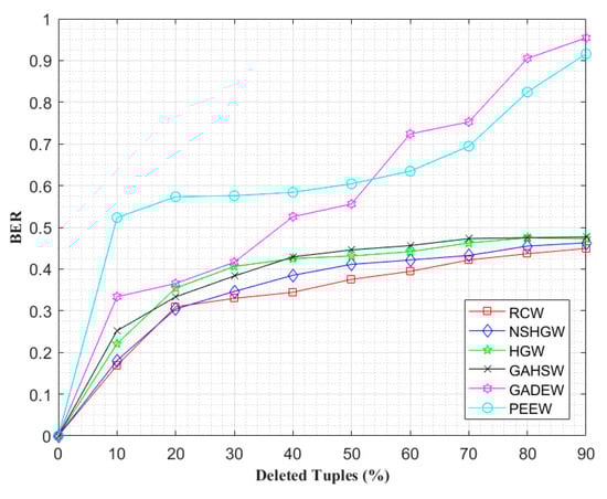 Deletion attack is a random deletion of tuples to destroy the watermark. When the database is attacked by deletion, as the number of deleted tuples increases, the proportion of deleted tuples containing watermark information will also increase and the bit error rate of the extracting watermark will also increase. Figure 4 shows the BER of the watermark extracted by RCW, NSHGW, HGW, GAHSW, PEEW, and GADEW methods after removing the attack. For example, when the database is severely deleted, the proportion of tuple deleted in the database becomes 90%. NSHGW, HGW, GAHSW, GADEW, and PEEW extract the watermark with BER values of 0.462, 0.472, 0.477, 0.954, and 0.916, respectively. However, the BER extracted by the RCW watermark is 0.449. If you delete most of the watermark information contained in the tuple, you cannot recover the watermark. If it is only a little more than half, the RCW method can be restored. To sum up, deletion of the tuple attack has the greatest impact on the database watermarking information.